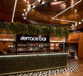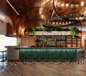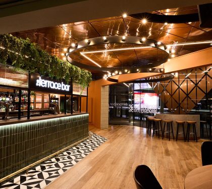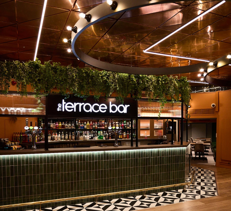 One of the bar’s best features is its terrace overlooking the busy campus. To emphasise the connection between the interior of the bar and its external space, we’ve used lots of biophilic design – for example, adding foliage above the bar and a colour palette that reflects the natural world.