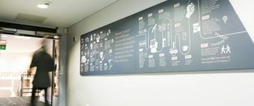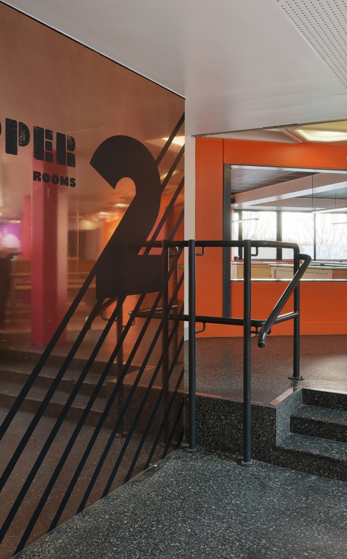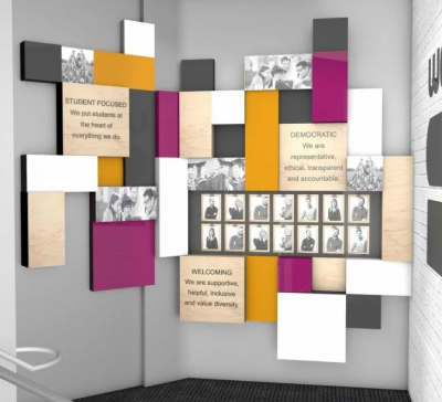 One of our skills as designers is to be able to bring an organisation’s brand to life in three dimensions. You can see this in action in the SU. We’ve created bespoke graphics that communicate the university brand and signal to students that they’re in a public space, not a private office – that they’re meant to be here.