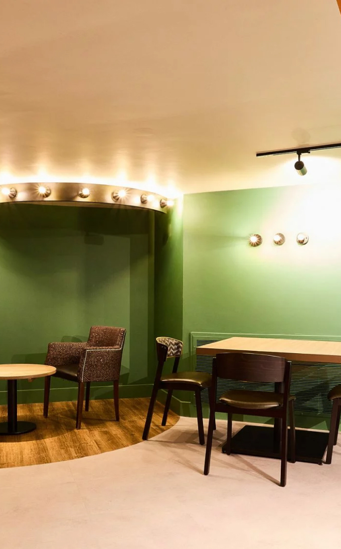 To maximise Warwick’s budget, we focused on enhancing what was already there. We restored the wooden dancefloor, polished the copper ceiling and revitalised the existing bar – adding bold tiles made it pop, visually whilst overhead glass racks, improved storage and a new coffee station have improved its functionality for the team.